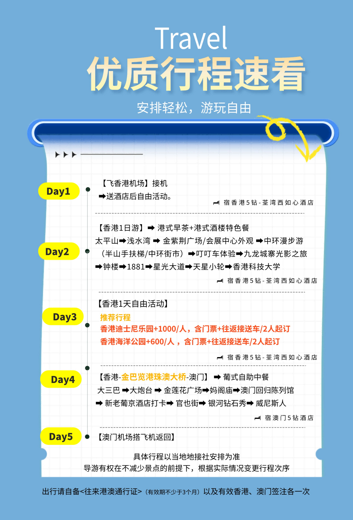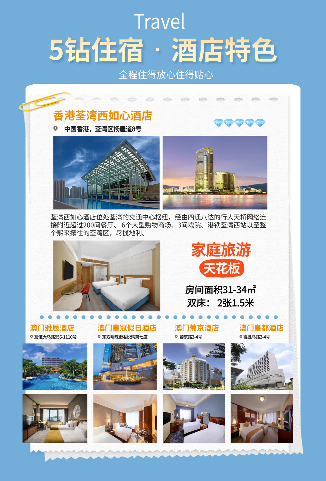 3、住宿(按2人1间):全程五钻酒店(香港3晚+澳门1晚),酒店均不含早。单人报名需补房差。