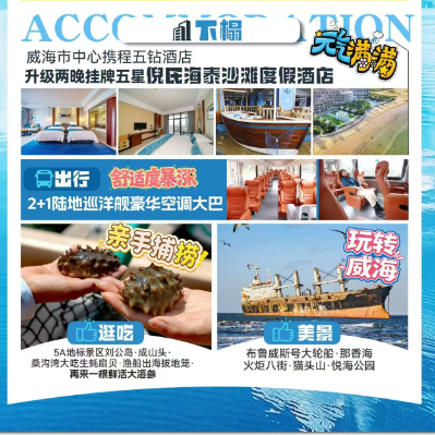 住宿——入住一晚威海市区携程五钻酒店,升级两晚挂牌五星倪氏海泰沙滩度假酒店,每日尊享